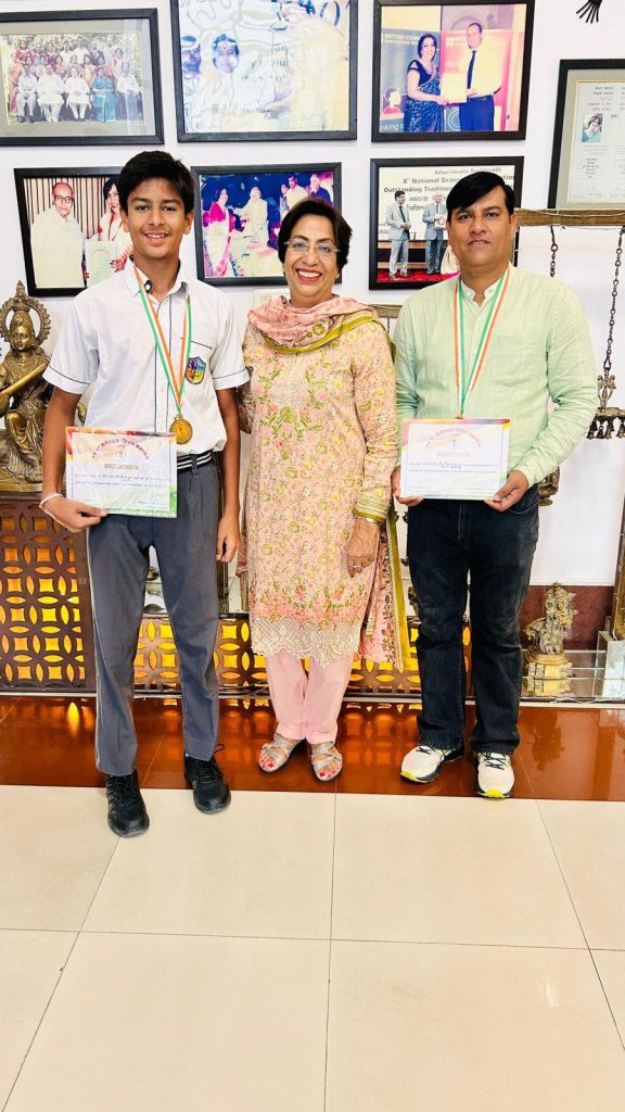 On the occasion of 79th Independence Day programme held at Guru Gobind Singh Stadium, the chief guest Mr. Tarunpreet Singh Sondh, Cabinet Minister, Punjab, honoured Mr Mohinder Pal, swimming coach at Police DAV Public School, Jalandhar Cantt, and Devansh Sharma, a student of class IX, for their excellent work and achievements.