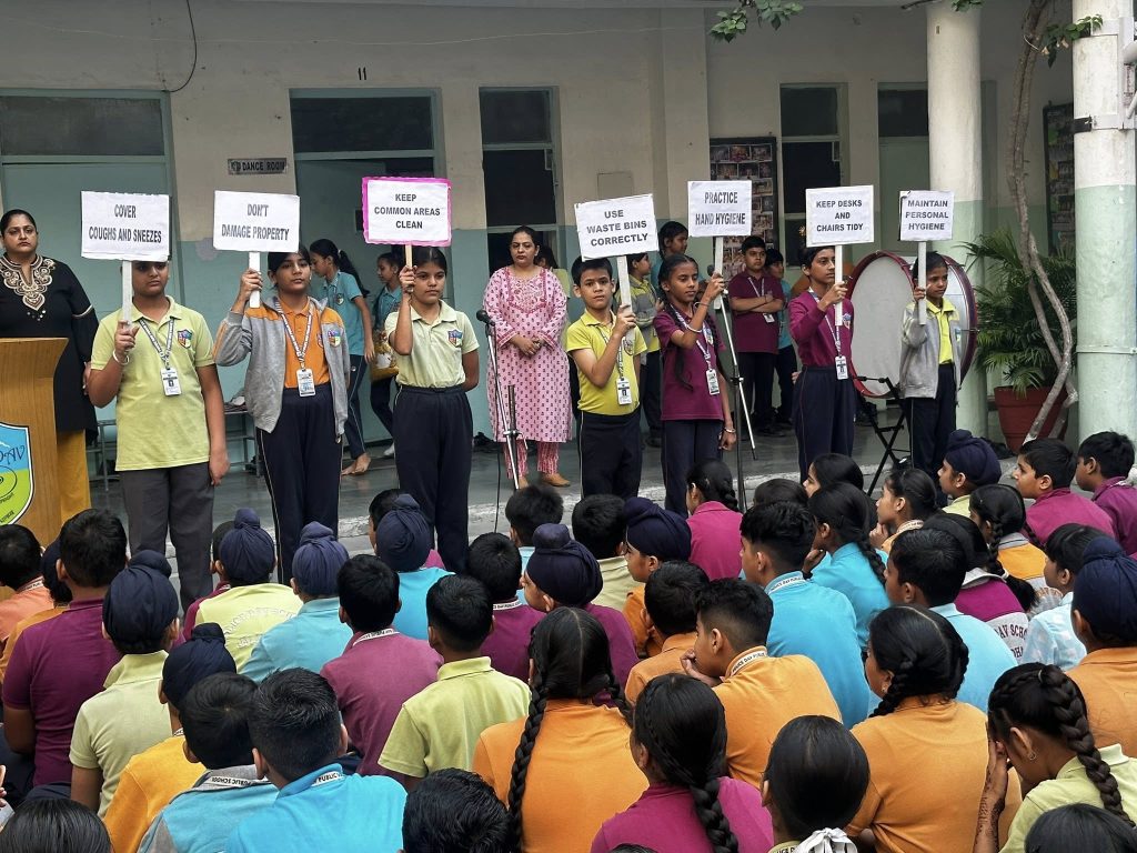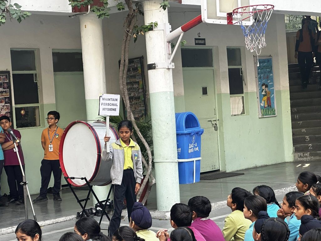 The assembly began with a lively poem recitation by students and teachers together, celebrating the spirit of cleanliness and hygiene. Their rhythmic voices and expressive gestures filled the atmosphere with enthusiasm and positivity.
